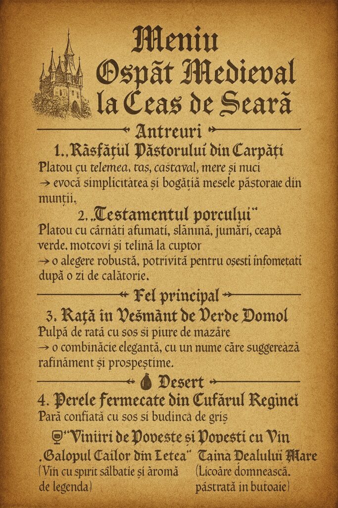În stânga, poți descoperi meniul serii – un festin ales cu grijă și nume de poveste, de la „Răsfățul Păstorului” la „Perele Fermecate din Cufărul Reginei”.